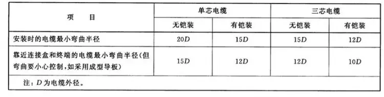 無鎧裝電纜,應不低于電纜外徑的6D;鎧裝或銅帶屏蔽電纜,應不低于電纜外徑的12D;屏蔽軟電纜,就不低于電纜外徑的6D。