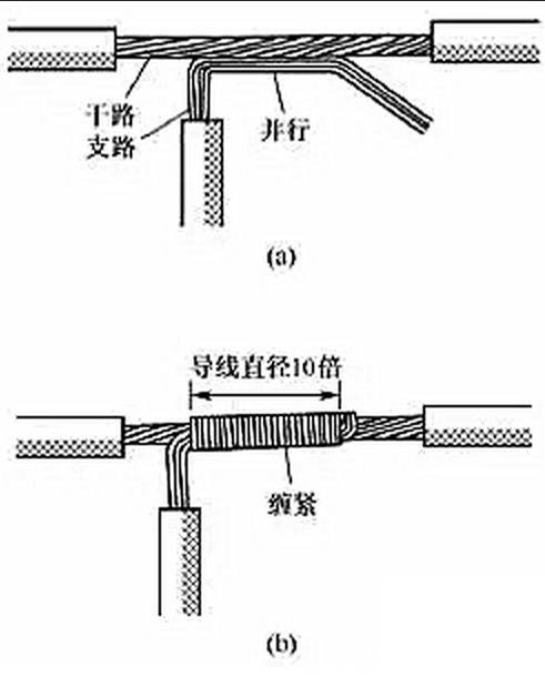 (6)同一方向的導(dǎo)線的連接。當(dāng)需要連接的導(dǎo)線來自同一方向時(shí),可以采用圖10所示的方法。對(duì)于單股導(dǎo)線,可將一根導(dǎo)線的芯線緊密纏繞在其他導(dǎo)線的芯線上,再將其他芯線的線頭折回壓緊即可。對(duì)于多股導(dǎo)線,可將兩根導(dǎo)線的芯線互相交叉,然后絞合擰緊即可。對(duì)于單股導(dǎo)線與多股導(dǎo)線的連接,可將多股導(dǎo)線的芯線緊密纏繞在單股導(dǎo)線的芯線上,再將單股芯線的線頭折回壓緊即可。