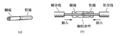 一種方法是采用銅鋁連接套管。銅鋁連接套管的一端是銅質(zhì),另一端是鋁質(zhì),如圖15(a)所示。使用時(shí)將銅導(dǎo)線的芯線插入套管的銅端,將鋁導(dǎo)線的芯線插入套管的鋁端,然后壓緊套管即可,如圖15(b)所示。